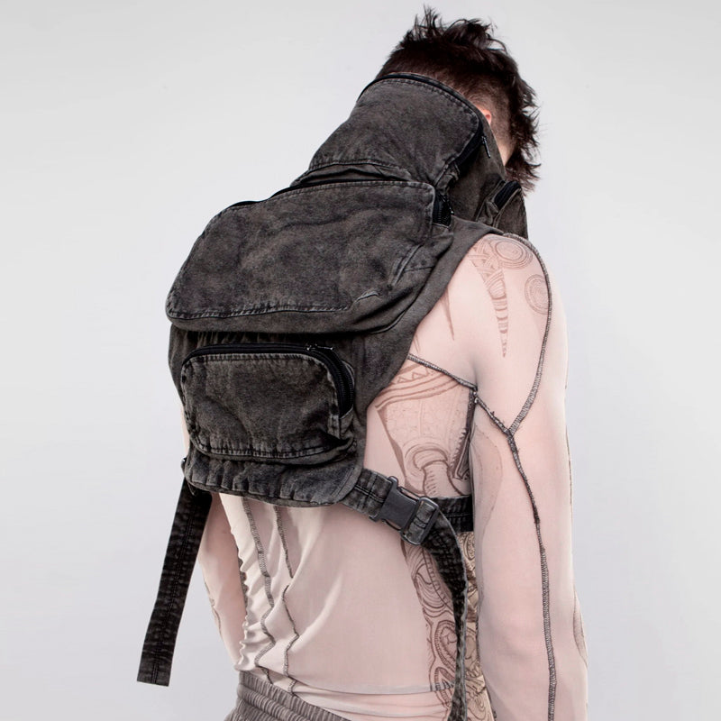 This vest represents the intersection of utilitarian design and contemporary fashion. The asymmetrical styling and three-dimensional pockets create a piece that's both functional and fashion-forward.