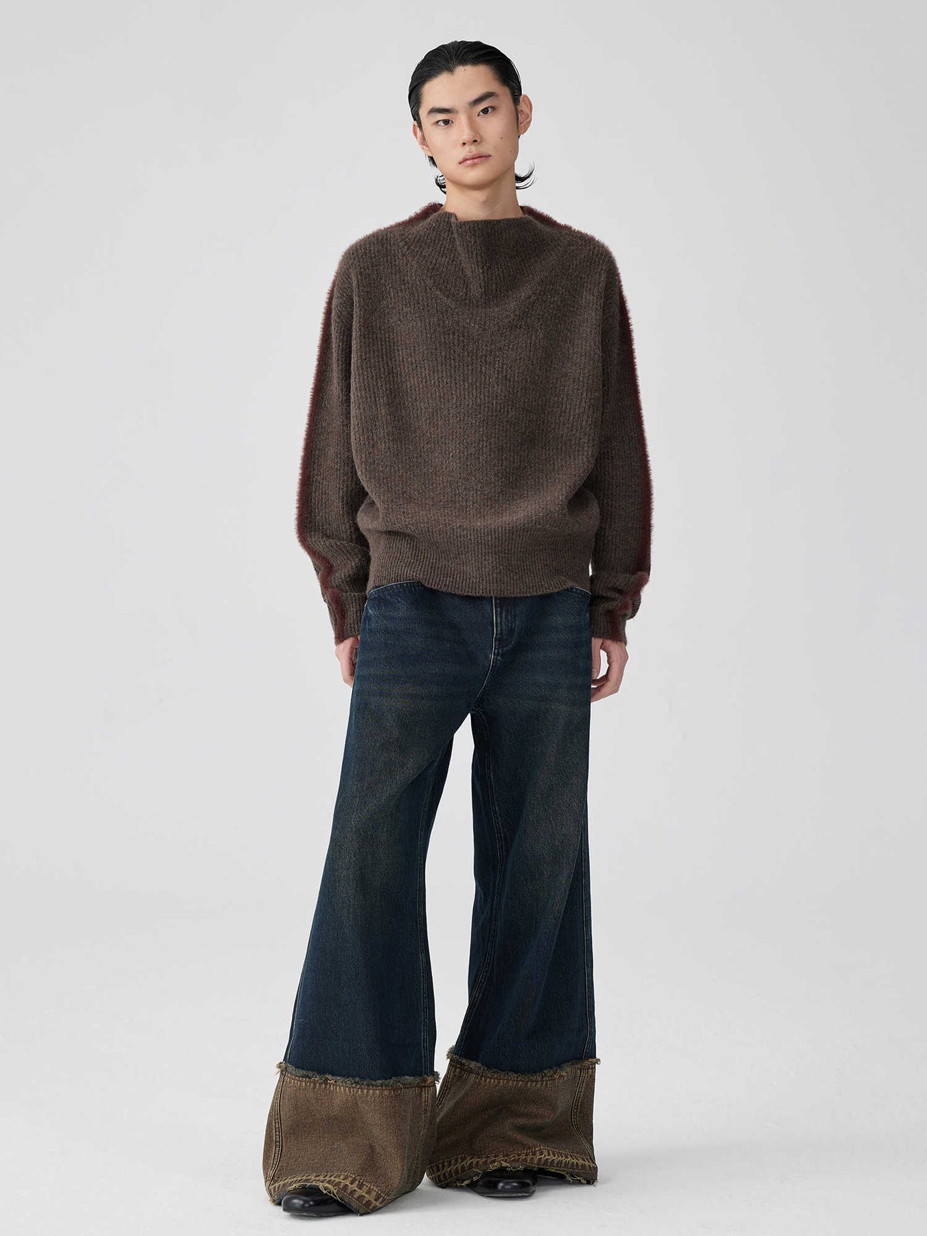 Discover unique craftsmanship with the SHOP BAM Brown-Blue Nano Water Reverse-Stitch Raw Hem Denim. Featuring innovative nano water foot washing technique with reverse stitching and raw hem details, these premium 100% cotton jeans offer distinctive brown-blue tones. Authentic construction meets artistic design.