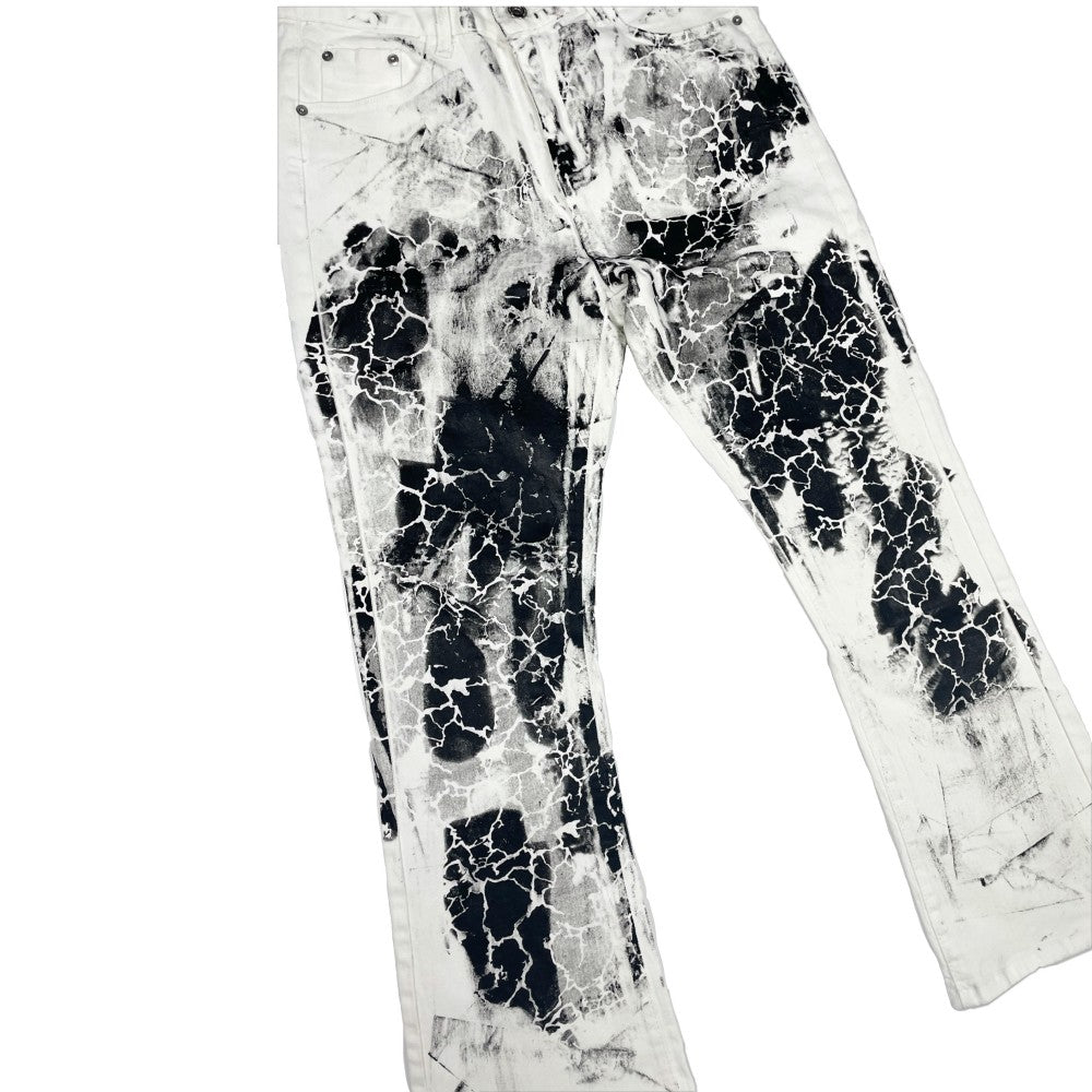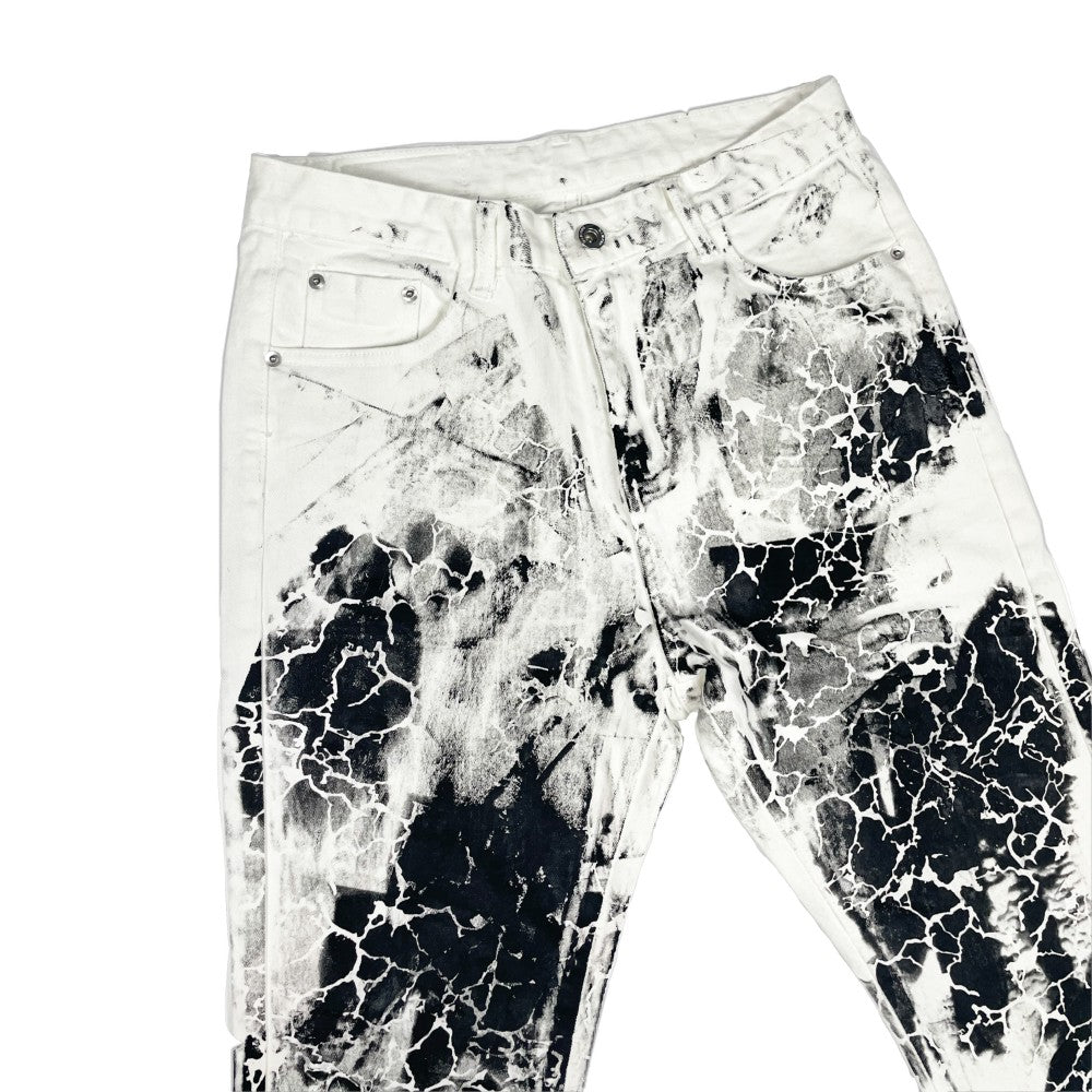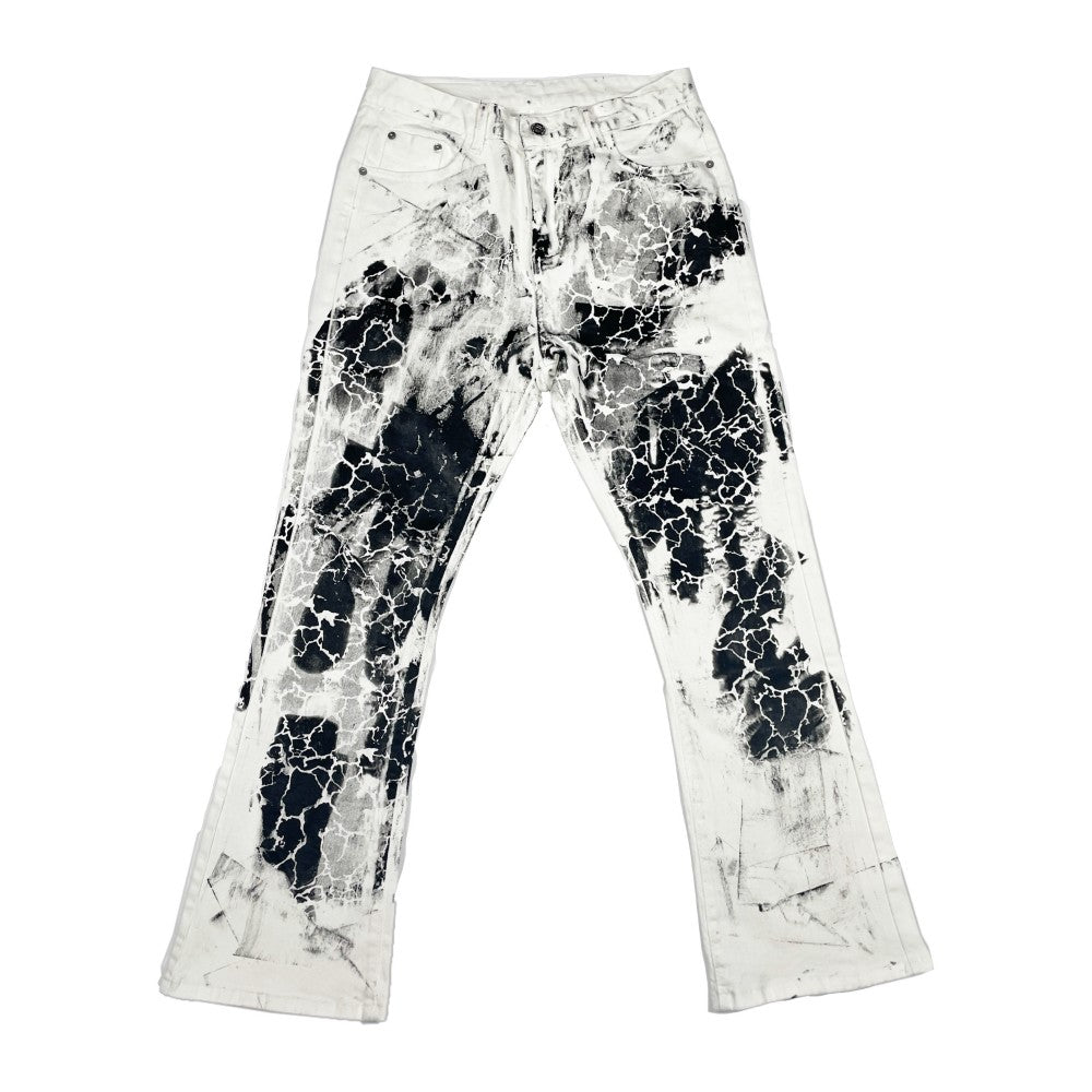 Crafted from premium denim with micro-elasticity. The loose micro-flared cut with wash-old water and splash ink treatment creates a distinctive niche aesthetic with artistic appeal.