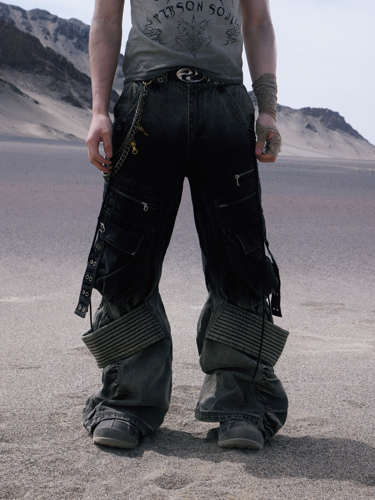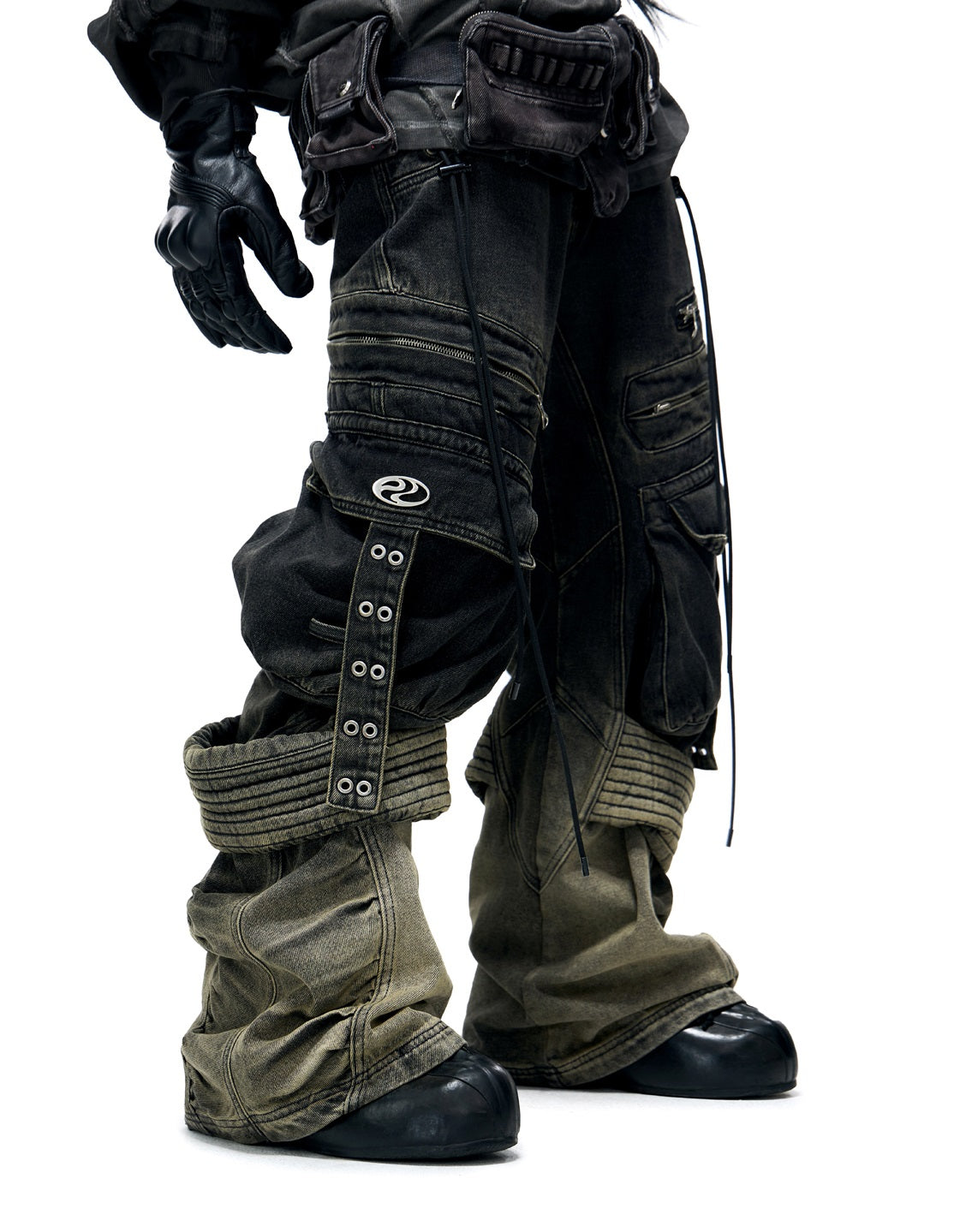 Crafted from premium non-stretch denim with regular thickness. The straight-leg cut with unique gradient grey-to-black wash creates a distinctive workwear-inspired aesthetic.