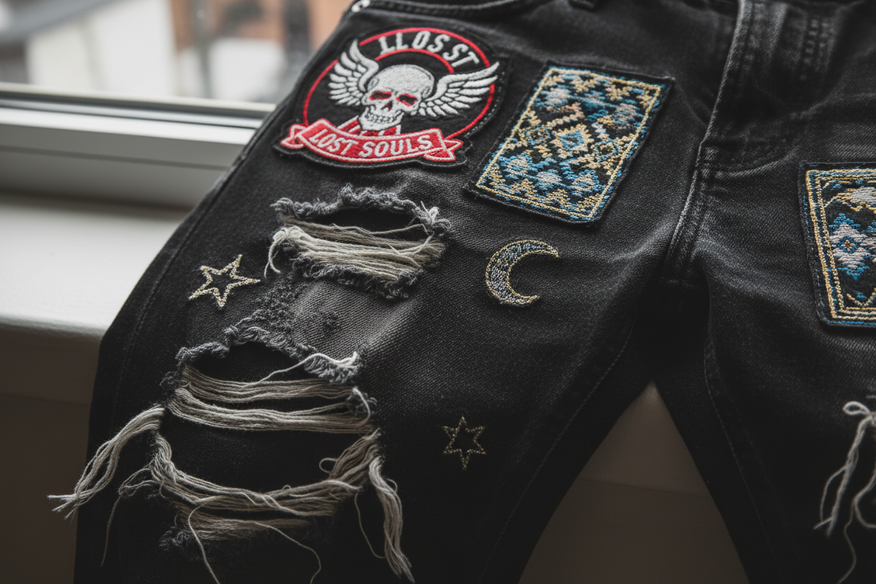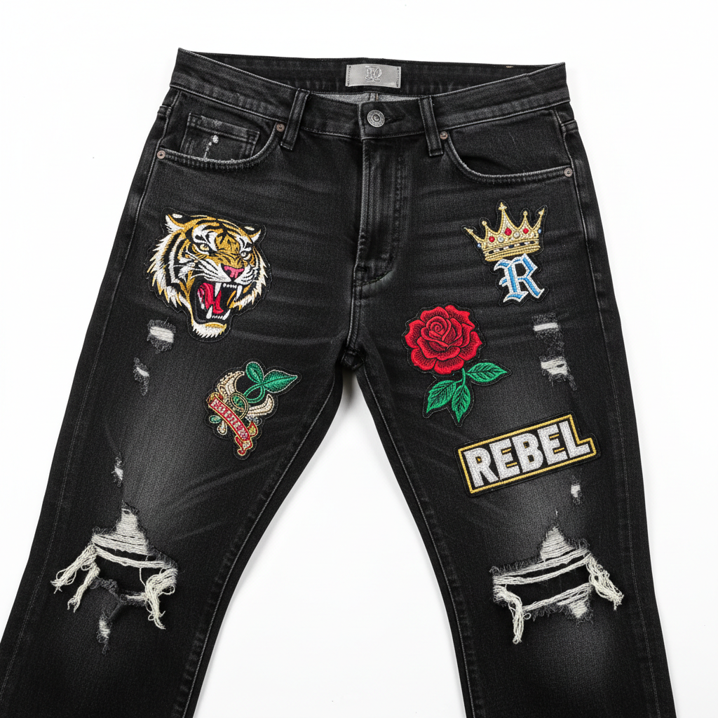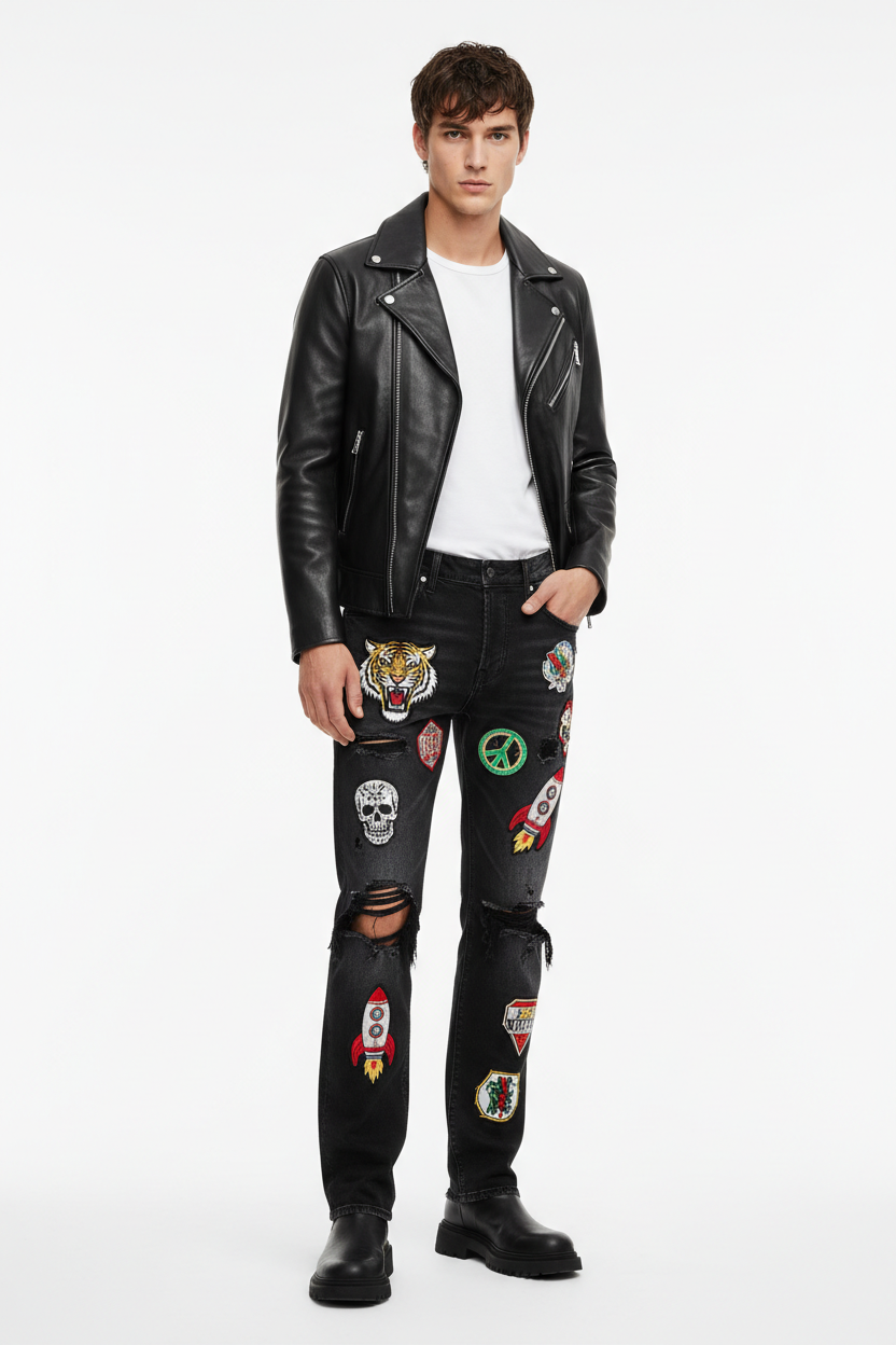 These premium badge-patch distressed denim jeans feature distinctive badge and patch detailing that creates authentic military-inspired appeal. Strategic distressing adds edgy character while premium construction ensures exceptional quality and contemporary style.