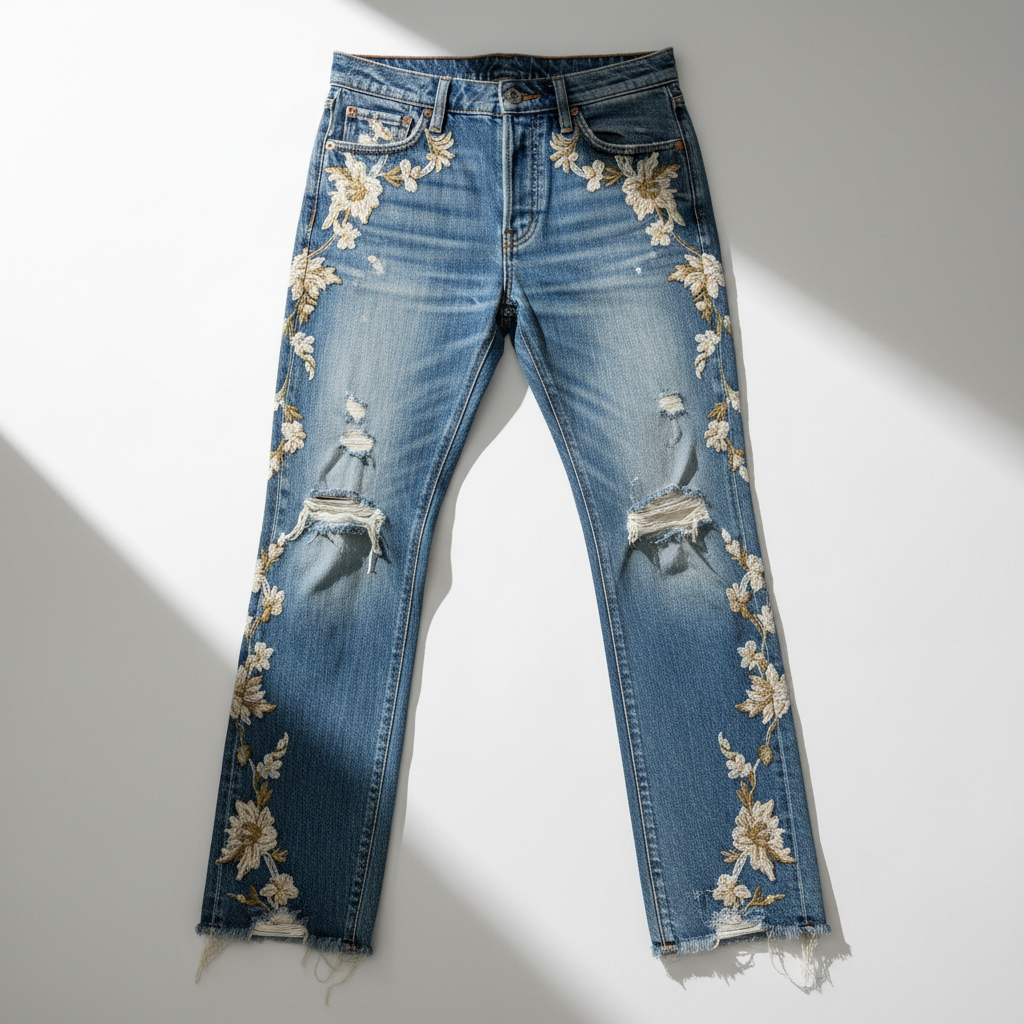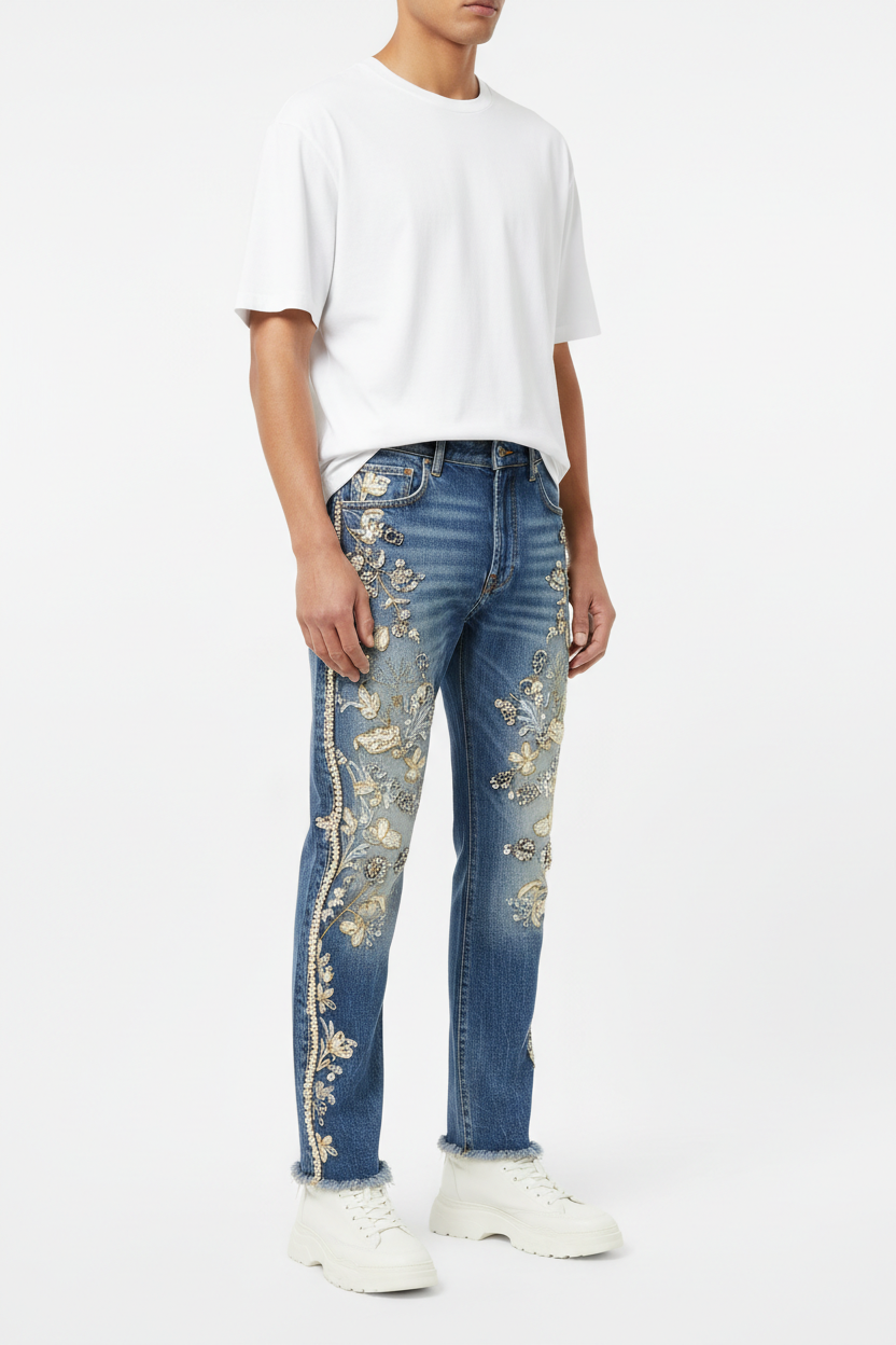 Elevate your denim collection with these meticulously crafted straight-leg jeans that blend vintage-inspired design with contemporary sophistication. Each pair showcases hand-finished distressing, raw frayed edges, and intricate embroidered details that celebrate the art of premium denim.