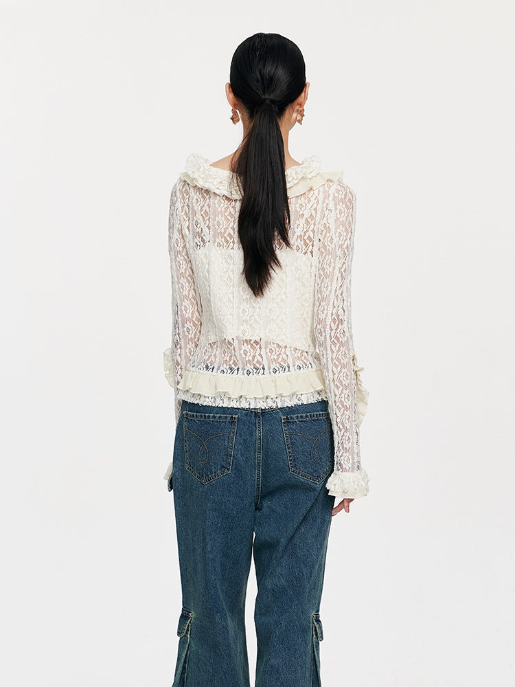 The ruffle edge trim (also known as fungus edge in some regions) creates a soft, feminine finish. This charming detail adds movement and delicate texture to the pullover's design.