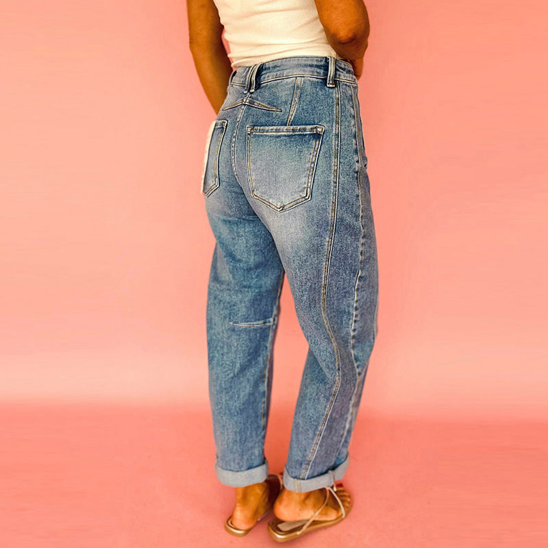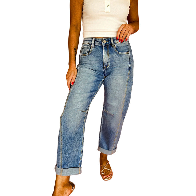 These premium versatile slim-fit rolled hem jeans feature a flattering slim silhouette and stylish rolled hem detailing. The slim fit creates sleek appeal while rolled hem adds casual sophistication.