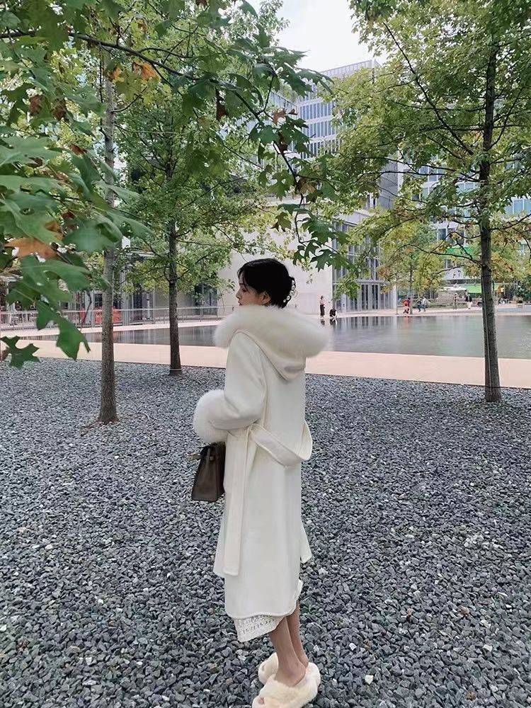 Thickened Woolen Coat Casual Hooded Lace-Up Fur Collar